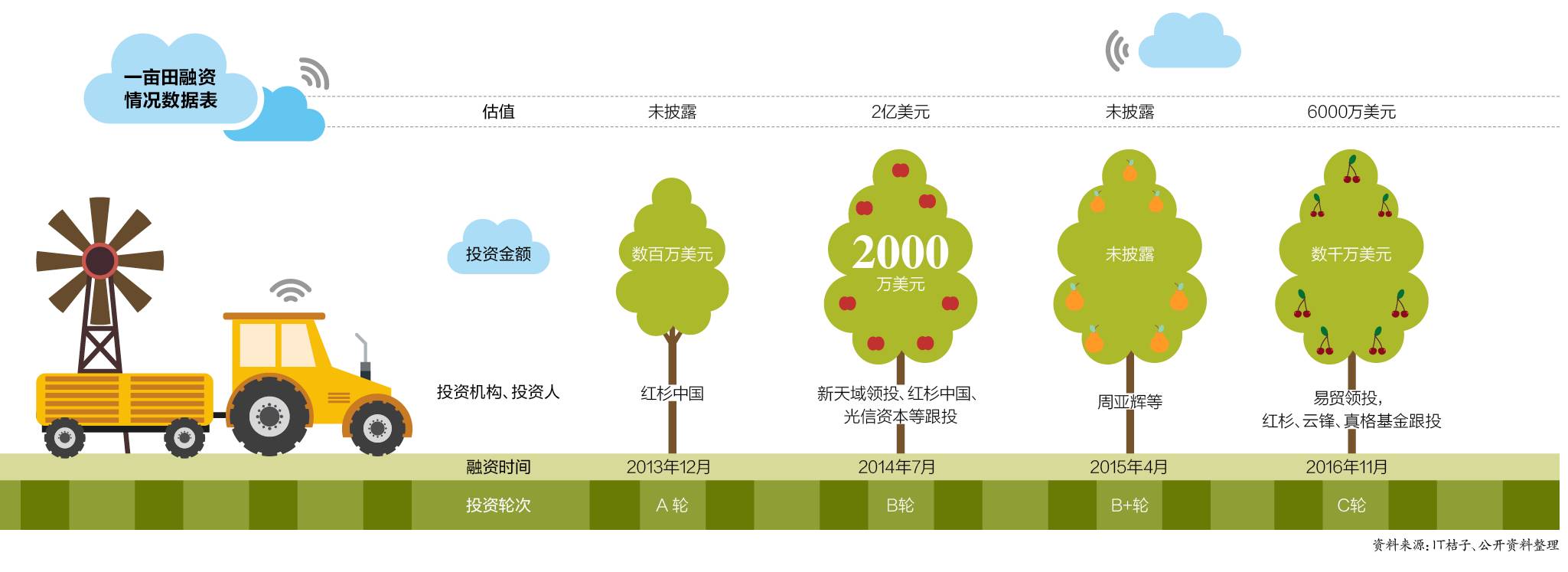 2016年11月,一亩田获得了C轮融资,由易贸领投,云锋基金、真格基金、红杉中国跟投,据相关媒体报道估值近6000万美元。